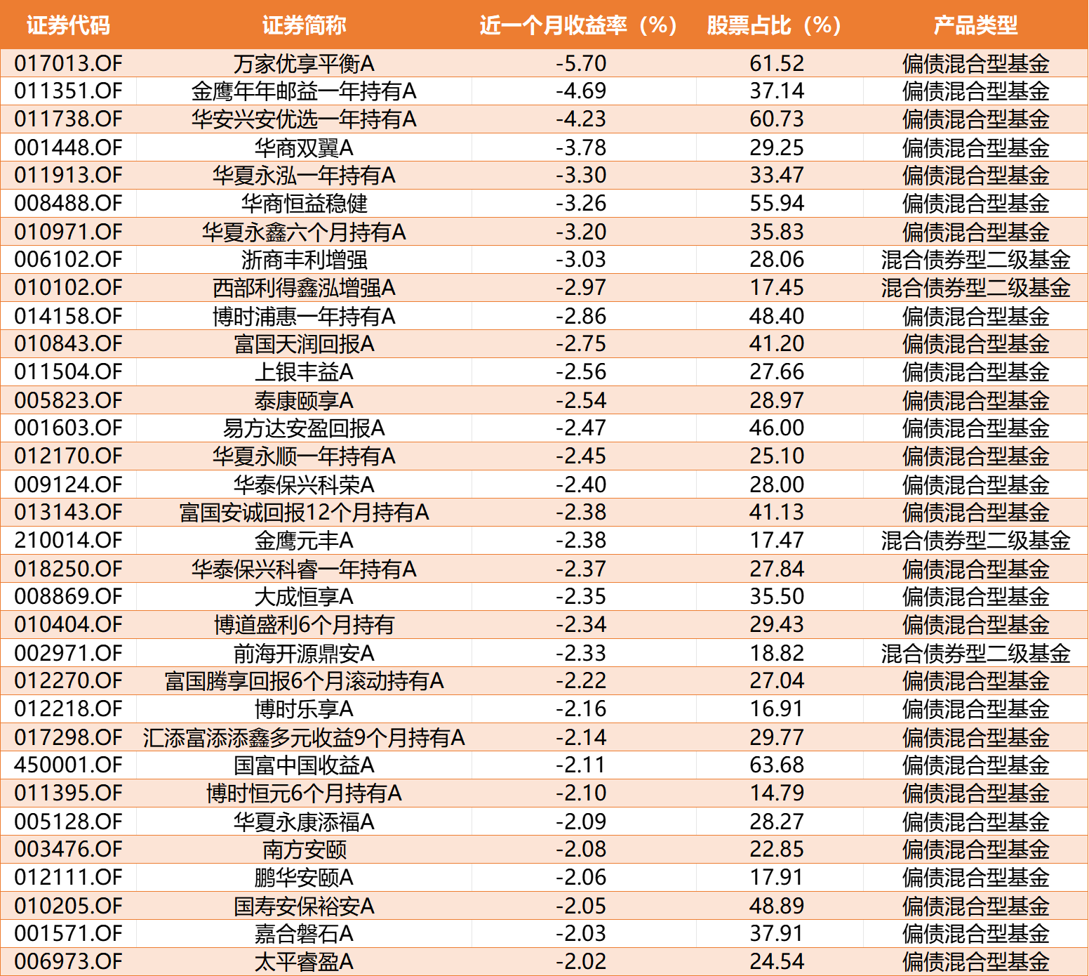 本月负收益的基金里回撤幅度超过2%的有33只。其中跌幅最大的是万家优享平衡基金,跌幅为5.7%;金鹰年年邮益和华安兴安优选收益率分别为-4.69%和-4.23%。