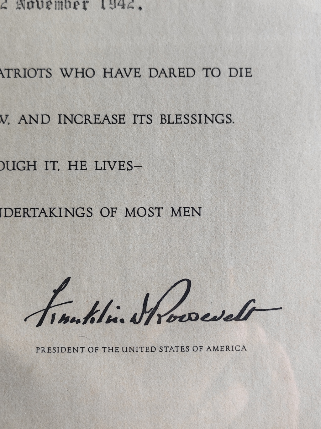 二战时期的美国总统罗斯福签署的纪念文件,以缅怀史密斯上尉在海外服役期间为国捐躯的英勇事迹
