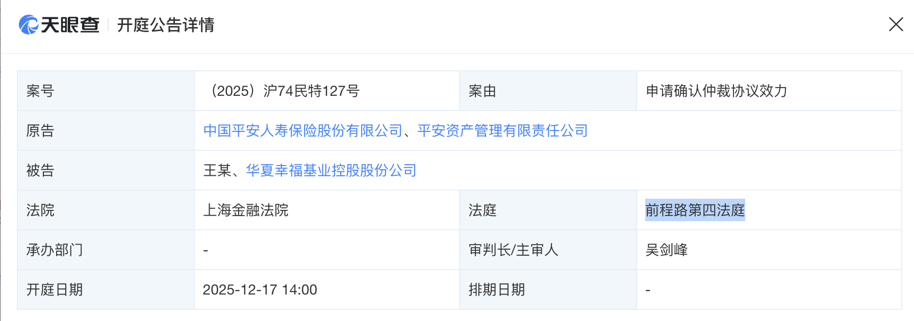 12月10日,澎湃新闻注意到,天眼查信息显示,中国平安人寿保险股份有限公司及平安资产管理有限责任公司起诉华夏幸福基业控股股份公司(华夏幸福,600340.SH)及王某,案由为申请确认仲裁协议效力。这一案件将于12月17日14时在上海金融法院开庭。