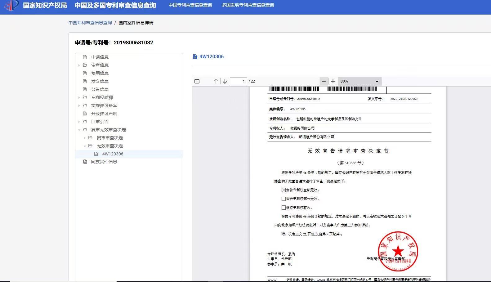 3月2日,界面新闻了解到,国家知识产权局已于2025年12月18日作出第610666号无效宣告请求审查决定。明月镜片针对法国眼镜企业依视路国际公司(下简称:依视路)持有的中国发明专利ZL201980068103.2提出无效宣告请求,其提交的全部无效理由获得支持,该专利被宣告全部无效。