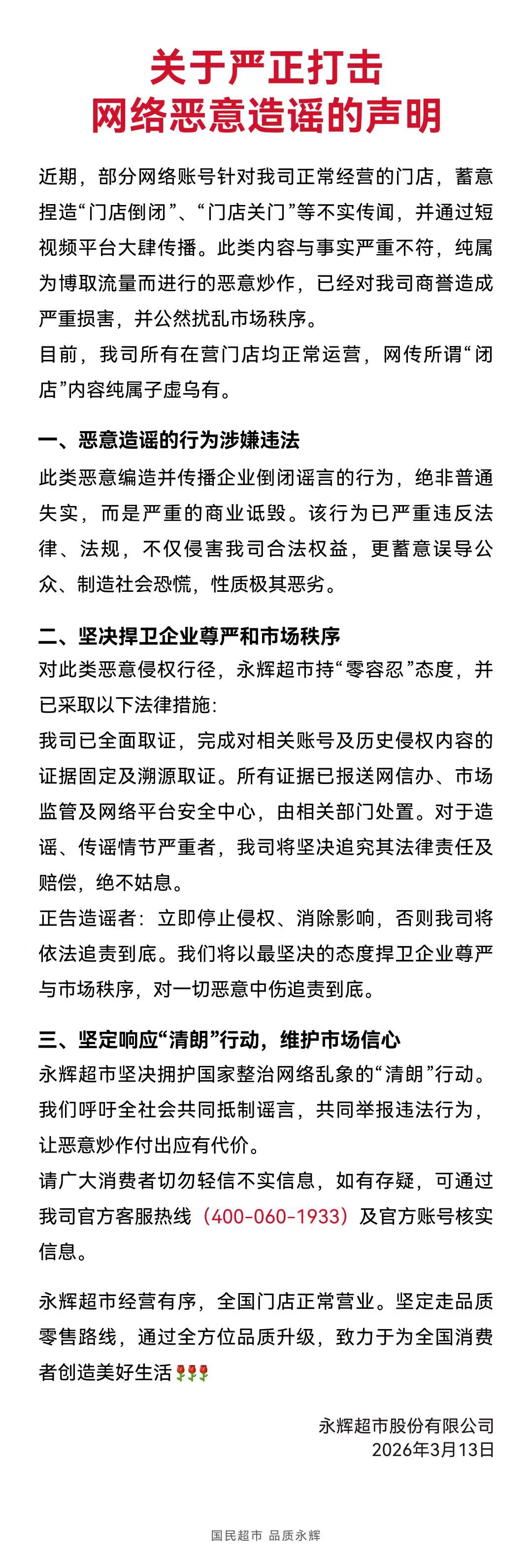 3月13日晚,永辉超市(601933.SH)发布“关于严正打击网络恶意造谣的声明”称,目前公司所有在营门店均正常运营,网传所谓“闭店”内容纯属子虚乌有。
