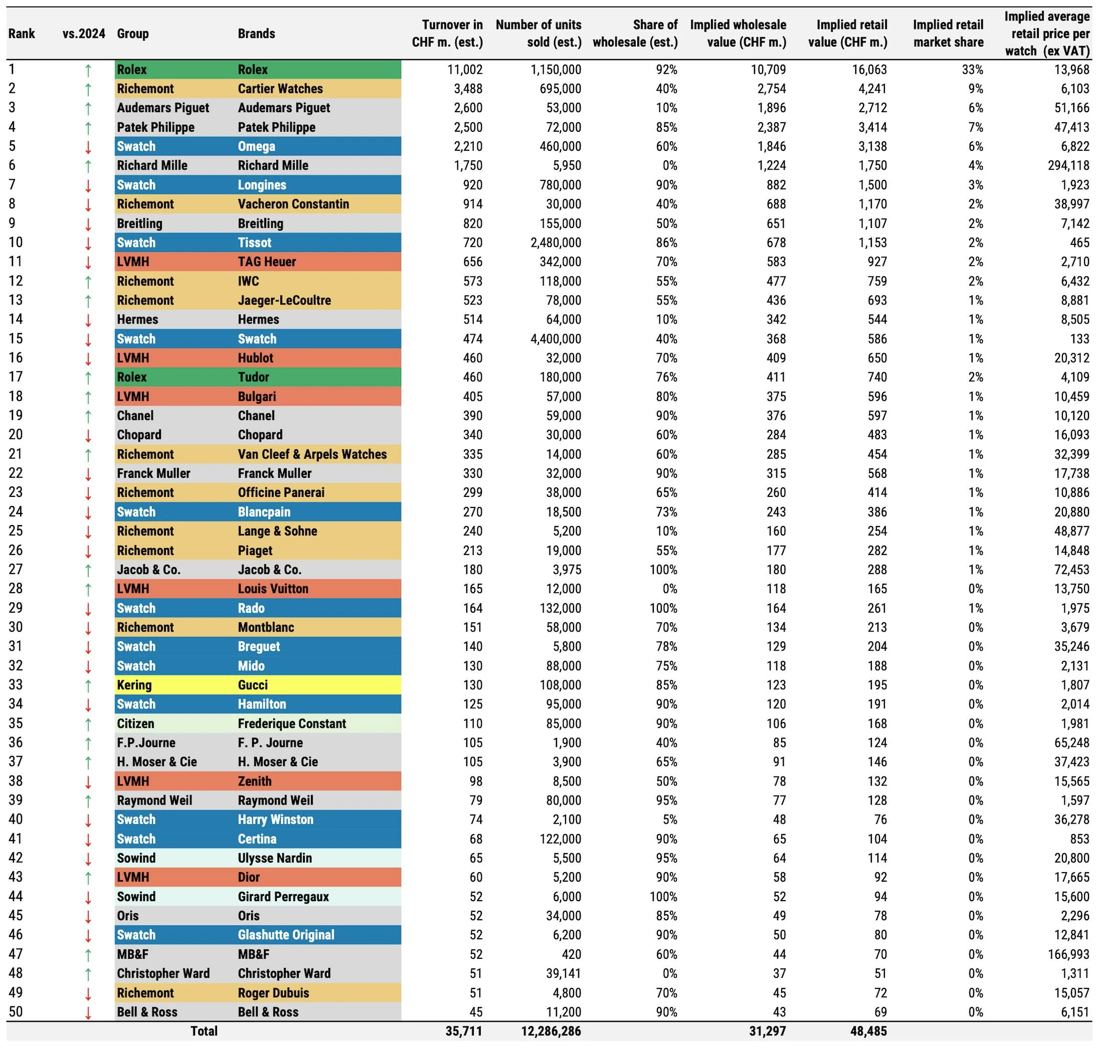 根据投资银行摩根史坦利在2026年3月发布的《2025瑞士制表商报告》,理查米尔于2025年全球市场同比营收预计录得17.5亿瑞郎(约合153.104亿元人民币),2024年该数据为15.4亿瑞郎,实现同比增长13.6%。这让理查米尔继续保持全球第六大钟表品牌,市场份额扩大至3.6%,位列与劳力士等其他四大独立制表商共同构建的“第一梯队”阵营。
