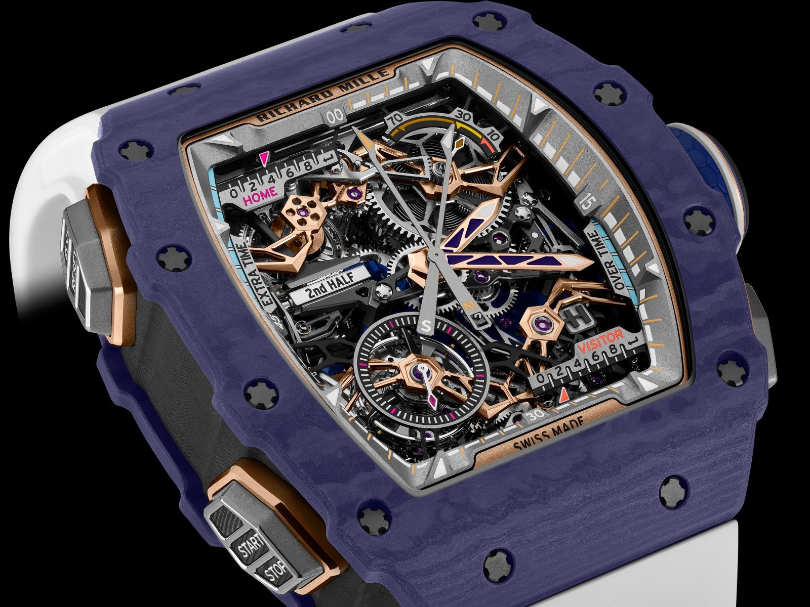2026年,理查米尔重磅推出RM 41-01足球陀飞轮腕表。这是理查米尔耗时五年为足球运动打造的全新表款,搭载一款全新且取得专利的陀飞轮飞返计时机芯,能够实现赛事阶段指示器与进球计数器两大显示功能,追踪一场足球赛事的全过程。