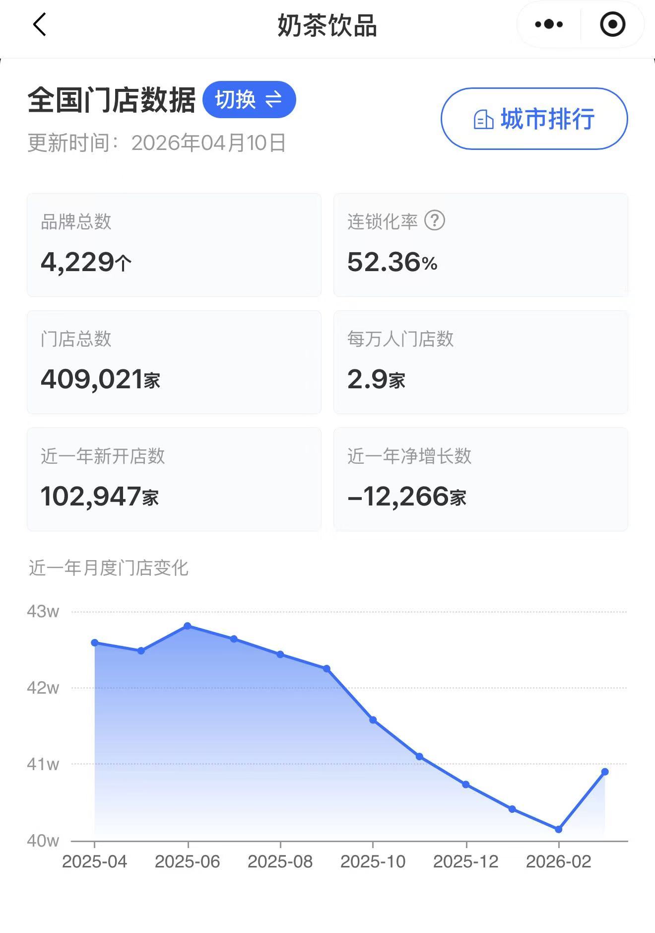 截至2026年4月10日,奶茶饮品赛道品牌总数超4000个,门店总数超40万家,近一年新开门店超过10万家,但净增长却是负数,总体量一年内减少了1.2万家门店。